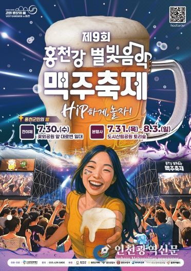 [인천광역신문] 관리자 기자 | 제9회 홍천강 별빛음악 맥주축제가 "Hip하게, 놀자!"라는 톡톡 튀는 슬로건 아래 7월 30일 꽃뫼공원 앞 대로변에서의 화려한 전야제를 시작으로 7월 31일부터 8월 3일까지 도시산림공원 토리숲에서 본격적으로 열린다.