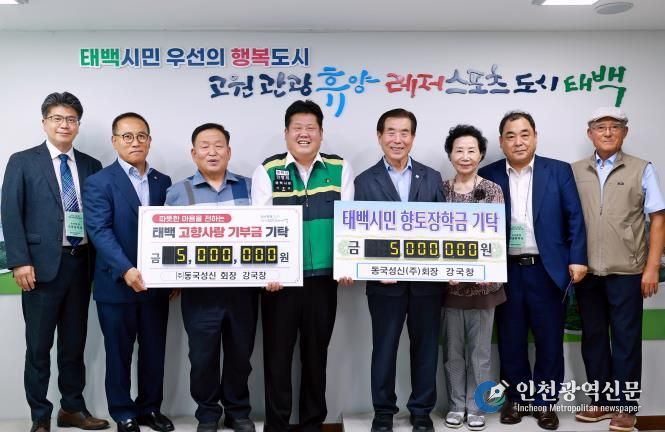 [인천광역신문] 관리자 기자 | 태백시는 ㈜동국성신 강국창 회장이 3년 연속 고향사랑기부금 5백만 원을 기탁하고, 고향 인재 양성을 위한 장학금 5백만 원을 추가로 기부하여 고향사랑을 실천했다고 전했다.