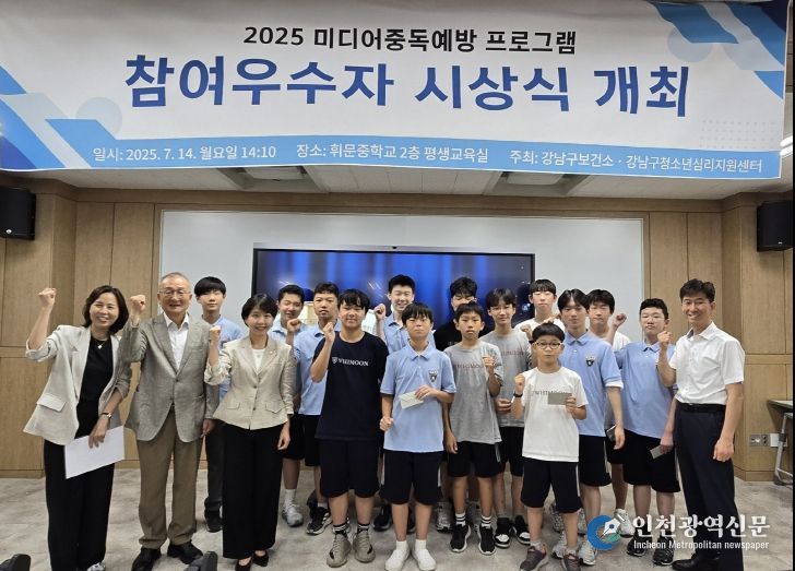 [인천광역신문] 최훈 기자 | 서울특별시 강남구의회 경제도시위원회 이도희 위원장(도곡1·2동)은 지난 7월 14일 휘문중학교에서 열린 ‘청소년 미디어중독 예방 프로그램’ 시상식에 참석해, 청소년들의 미디어 중독예방에 직접 나섰다.