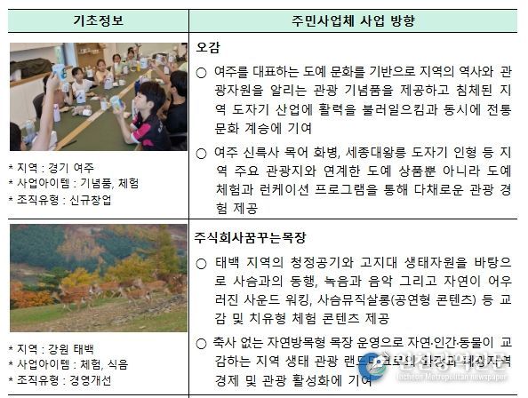 문체부 정책 담당자는 “올해 새롭게 선정된 주민사업체가 관광두레를 통해 지역을 대표하는 브랜드로 성장할 수 있도록 적극 지원해 나가겠다.”라고 밝혔다.