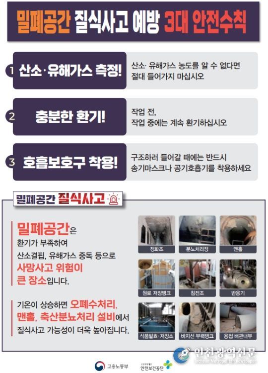 [인천광역신문] 관리자 기자 | 고용노동부는 최근 폭염 속에서 맨홀작업 중 질식재해가 급증함에 따라 관계기관 합동으로 “혹서기 맨홀 질식사고 근절 특단대책”을 추진한다고 밝혔다.