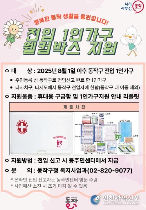 [인천광역신문] 최훈 기자 | 동작구가 8월 1일(금)부터 관내로 전입하는 1인 가구를 대상으로 특별한 웰컴박스를 지원한다고 밝혔다.