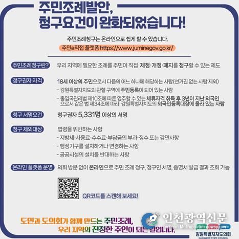 [인천광역신문] 관리자 기자 | 강원특별자치도의회가 지방자치 실현과 주민 주권 강화를 실현할 중요한 수단이 되는 ‘주민조례청구제도’의 활성화를 위해 홍보에 적극 나선다.