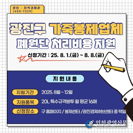 [인천광역신문] 최훈 기자 | 광진구가 서울시 자치구 최초로 관내 가죽 봉제업체의 폐원단 처리비용을 전격 지원한다고 밝혔다.