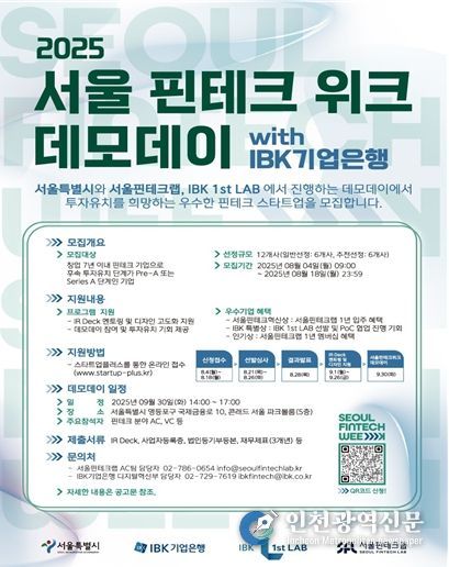 서울시는 글로벌 디지털금융 축제인 ‘서울핀테크위크 2025’의 핵심 프로그램 ‘데모데이 with IBK기업은행’에 참가할 혁신 AI・핀테크 스타트업을 8월 4일부터 18일까지 모집한다고 밝혔다.