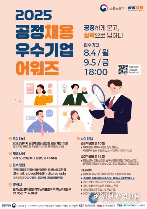[인천광역신문] 관리자 기자 | 고용노동부와 한국산업인력공단은 공정채용 우수기업 어워즈를 개최하여 8월 4일부터 9월 5일까지 기업과 공공기관의 선도적인 공정채용 사례를 모집한다고 밝혔다.
