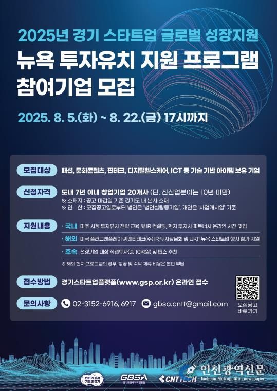 [인천광역신문] 관리자 기자 | 경기도와 경기도경제과학진흥원은 도내 스타트업의 미국 시장 진출을 위해 ‘2025년 경기 스타트업 글로벌 성장지원 뉴욕 투자유치 지원 프로그램’에 참여할 기업을 오는 22일까지 모집한다.