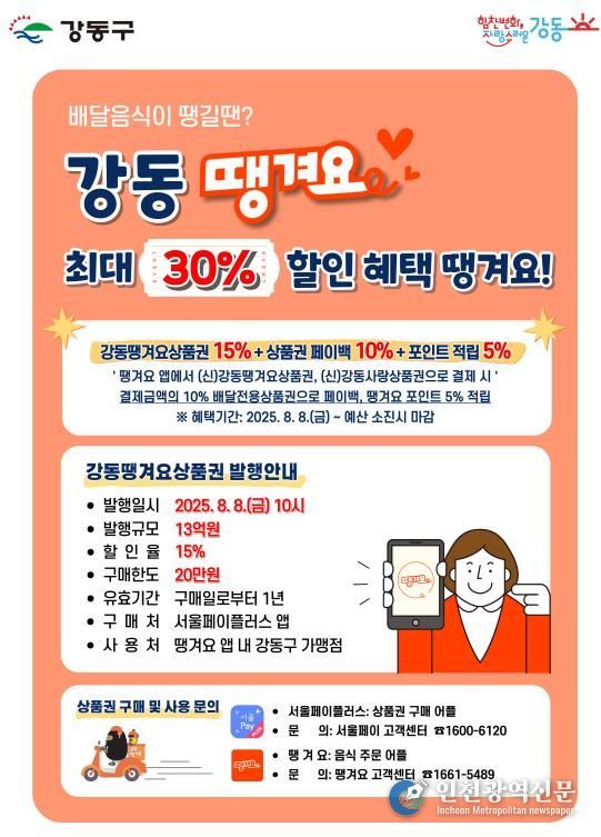 이수희 강동구청장은 “강동땡겨요상품권 발행은 소상공인들의 실질적인 매출 증대는 물론, 구민들께도 체감도 높은 소비 혜택을 제공하는 정책”이라며, “앞으로도 공공배달앱 활성화와 지역경제 회복을 위해 실효성 있는 지원책을 꾸준히 마련하겠다”라고 말했다.