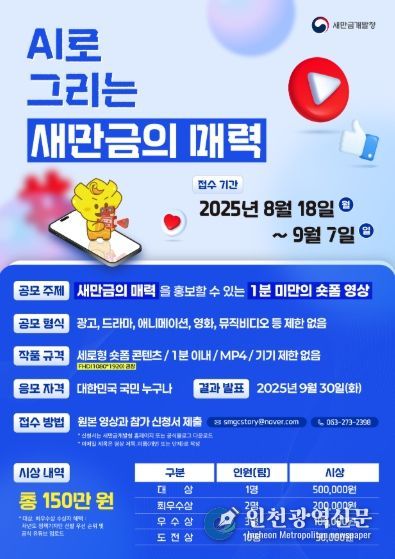 [인천광역신문] 관리자 기자 | 새만금개발청은 새만금의 다양한 매력을 인공지능(AI) 기술로 활용해 담아내는 ‘2025년 새만금 인공지능(AI) 숏폼(짧은 영상) 공모전’을 8월 18일부터 9월 7일까지 개최한다.