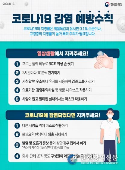 [인천광역신문] 관리자 기자 | 질병관리청은 병원급 의료기관의 코로나19 입원환자 수가 최근 6주 연속 증가하고, 향후 2주는 증가세가 지속될 것으로 예상된다며, 코로나19 확산을 최소화하고 고위험군을 보호하기 위해 코로나19 예방수칙을 준수해 달라고 당부했다.