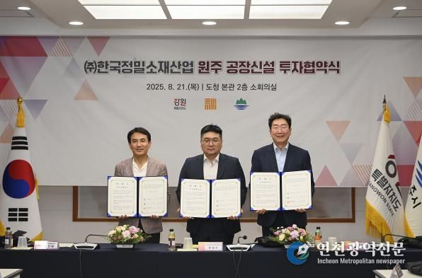 [인천광역신문] 관리자 기자 | 원주시와 강원특별자치도는 지난 21일 김진태 도지사, 원강수 시장, 윤형수 ㈜한국정밀소재산업 대표이사 등이 참석한 가운데, ㈜한국정밀소재산업과 부론산업단지 제조공장 신설을 위한 투자협약을 체결했다.