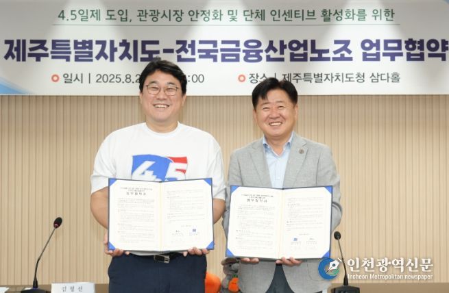 [인천광역신문] 관리자 기자 | 제주특별자치도가 전국금융산업노동조합과 손잡고 주 4.5일제 확산을 통한 관광시장 활성화에 나선다. 포괄적 협력체계를 구축해 노동과 관광이 상생하는 새로운 지역모델을 만들어나갈 방침이다.