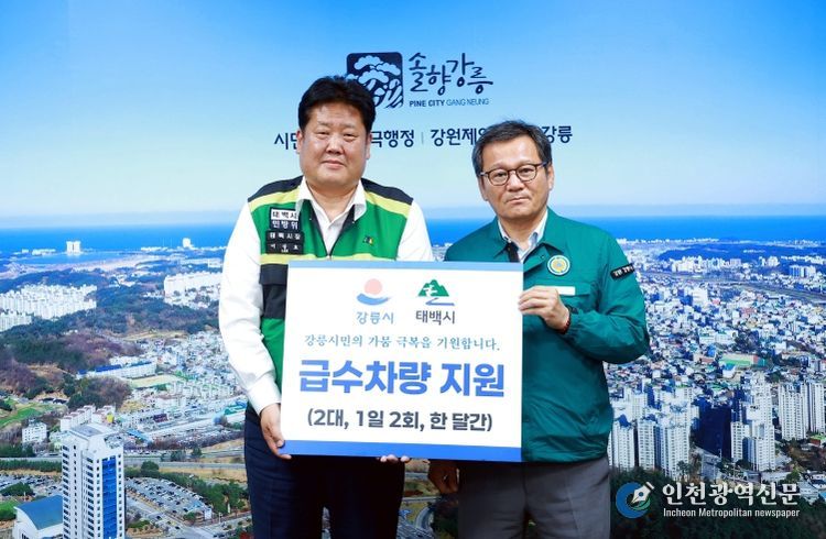 이상호 태백시장은 26일 강릉시청에서 김홍규 강릉시장과 급수차 지원 전달식을 갖고, 한 달간 급수차 2대를 매일 2회 강릉시에 파견해 급수 지원을 실시한다고 밝혔다.