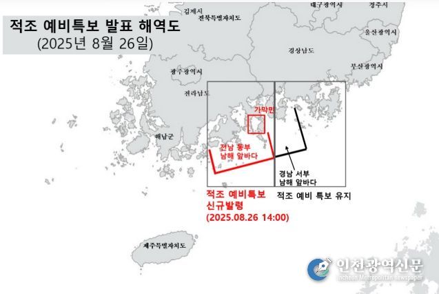 [인천광역신문] 관리자 기자 | 해양수산부는 8월 26일 16시부로 적조 위기경보 ‘주의’ 단계를 발령했다고 밝혔다. 이는 국립수산과학원이 8월 25일 경남 남해 앞바다에 이어, 하루만인 8월 26일에 전남 여수 가막만과 전남 남해에 추가로 예비특보를 발표함에 따른 조치이다.