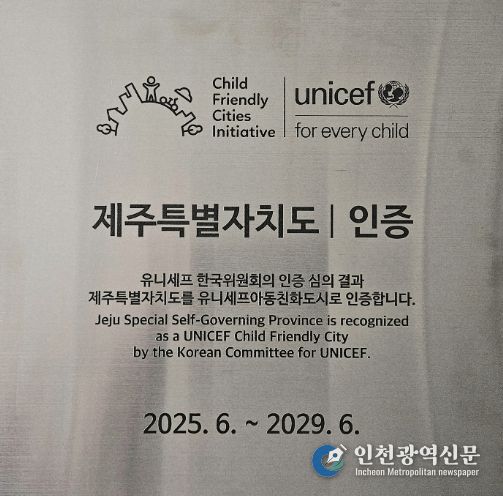 [인천광역신문] 관리자 기자 | 제주특별자치도가 유니세프 한국위원회로부터 아동친화도시(Child Friendly Cities) 인증을 획득했다. 부산, 대구, 광주, 세종에 이은 다섯 번째 광역지방자치단체이자, 도 단위 광역 지자체로는 전국 최초다.