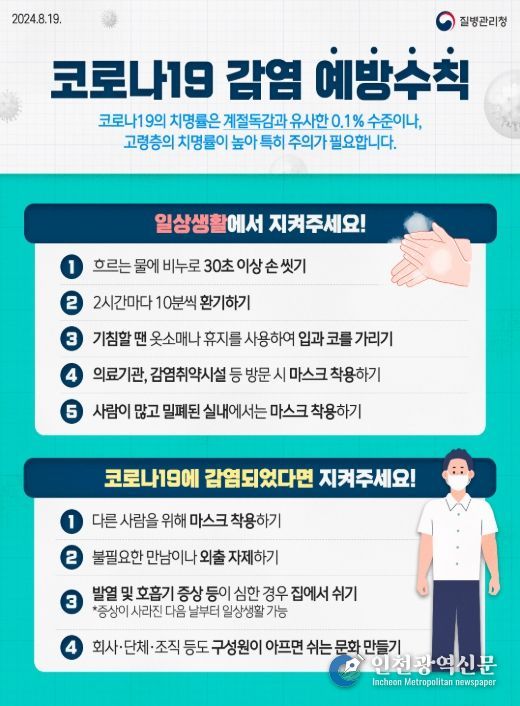 [인천광역신문] 관리자 기자 | 질병관리청은 병원급 의료기관의 주간 코로나19 입원환자 수가 8주째 증가하고 있어, 아직까지 여름철 코로나19 확산세가 지속되고 있는 것으로 판단하고, 어르신, 면역저하자 등 고위험군은 사람이 많은 곳 방문을 자제하고 마스크 착용 등 예방수칙을 잘 지켜달라고 당부했다.