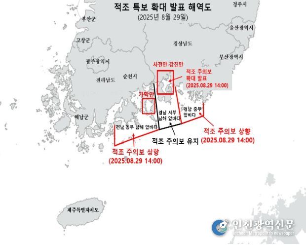 [인천광역신문] 관리자 기자 | 해양수산부는 8월 29일 16시부로 적조 위기경보 ‘경계’ 단계를 발령했다고 밝혔다.