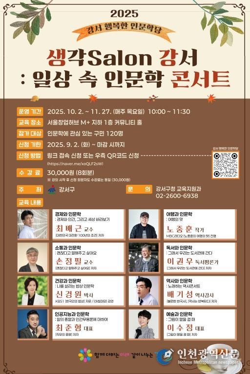 [인천광역신문] 최훈 기자 | 서울 강서구가 9월 2일부터 ‘강서 행복한 인문학당’의 수강생을 모집한다.
