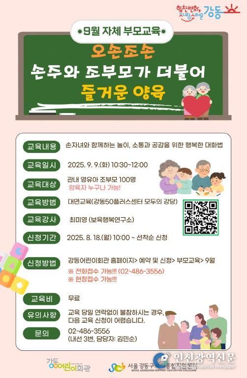 두 교육 모두 90분 동안 진행되며, 강동구 내 미취학 영유아를 양육하는 조부모와 부모라면 누구나 무료로 참여할 수 있다. 신청은 강동어린이회관 누리집(홈페이지)에서 가능하다.