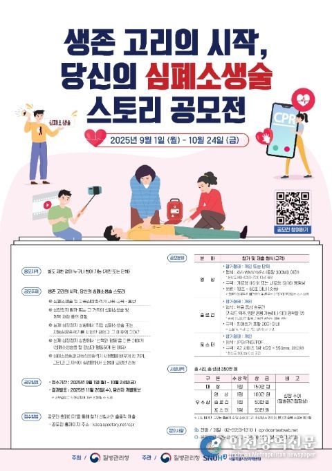 [인천광역신문] 관리자 기자 | 질병관리청은 심폐소생술 중요성에 대한 인식 제고 및 시행 확산을 위해 '생존 고리의 시작, 당신의 심폐소생술 스토리 공모전'을 개최한다.