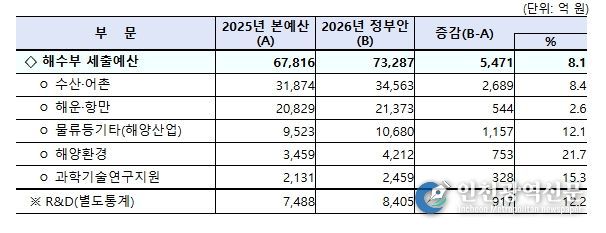 [인천광역신문] 관리자 기자 | 해양수산부는 2026년 정부 예산안을 올해 예산 6조 7,816억 원 보다 8.1%(5,471억 원) 증가한 7조 3,287억 원으로 편성했다고 밝혔다.