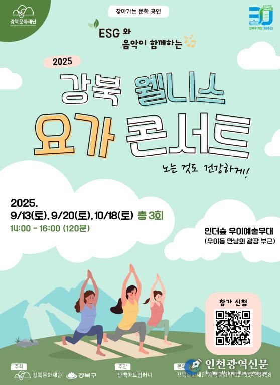 [인천광역신문] 최훈 기자 | 서울 강북문화재단은 오는 9월 13일, 20일, 10월 18일 우이동 인더숲 우이예술무대에서 ESG와 음악이 함께하는 ’강북 웰니스 요가 콘서트‘를 개최한다.