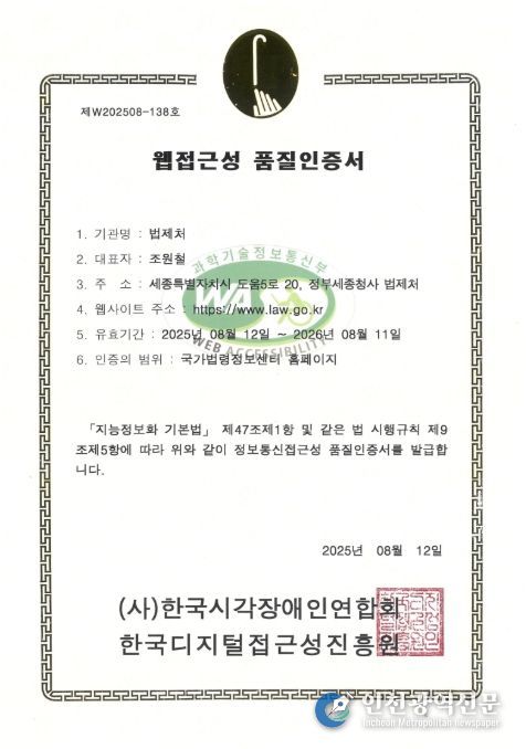 [인천광역신문] 관리자 기자 | 법제처는 9월 3일, 국가법령정보센터가 2년 연속 웹과 모바일 앱 모두 접근성 품질인증을 획득했다고 밝혔다. 2024년에 처음으로 웹과 모바일 앱 모두 인증을 획득한 데 이어, 올해도 정보취약계층의 접근성이 우수하다는 점을 다시 한 번 확인받은 것이다.