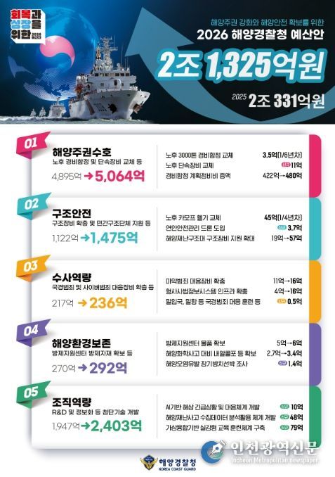 [인천광역신문] 관리자 기자 | 해양경찰청은 8월 29일 국무회의 의결을 통해 2026년 해양주권 강화와 해양안전 확보를 위한 해양경찰청 예산이 국회에 제출(9월 3일)된다고 밝혔다.
