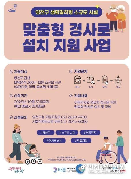 [인천광역신문] 최훈 기자 | 양천구는 장애인·노약자·임산부·어린이 등 이동약자의 접근 편의를 높이기 위해 ‘생활밀착형 소규모시설’ 경사로 무상설치 지원사업을 추진하고, 10월 31일까지 신청자를 모집한다고 밝혔다.