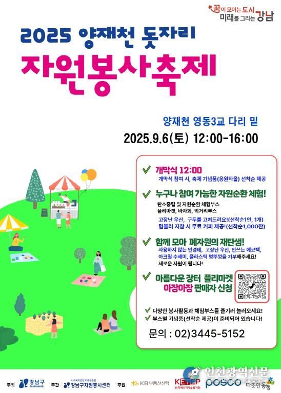 [인천광역신문] 최훈 기자 | 꿈이 모이는 도시, 미래를 그리는 강남구는 오는 9월 6일낮 12시부터 오후 4시까지 양재천 영동3교 하단에서 약 3,500명의 주민과 자원봉사자가 함께하는 ‘양재천 돗자리 자원봉사 축제’를 개최한다.