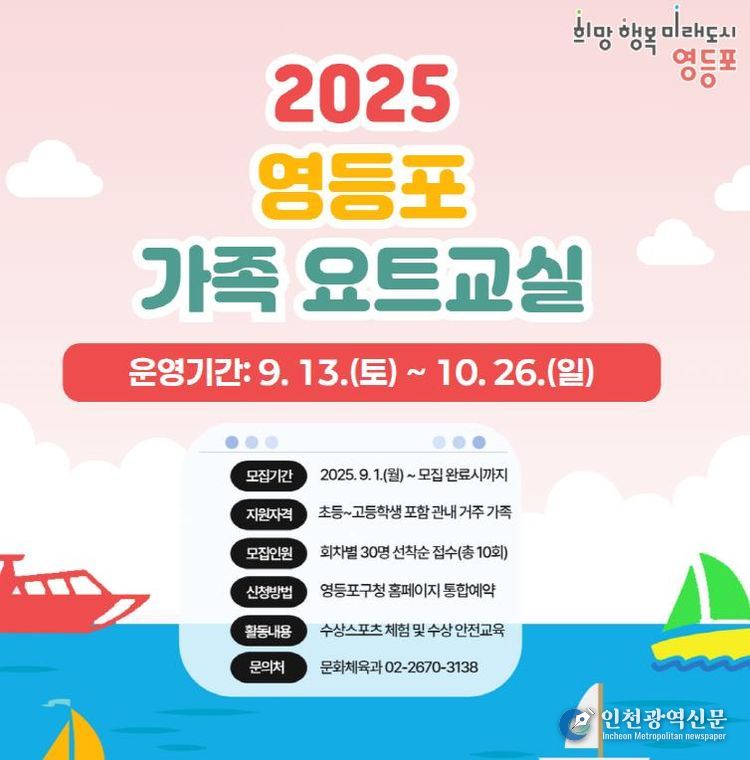 [인천광역신문] 최훈 기자 | 영등포구가 오는 9월 13일부터 10월 26일까지 여의도 한강 서울마리나에서 가족이 함께 즐길 수 있는 수상레저 체험 프로그램 ‘2025 영등포 가족 요트 교실’을 운영한다고 밝혔다.