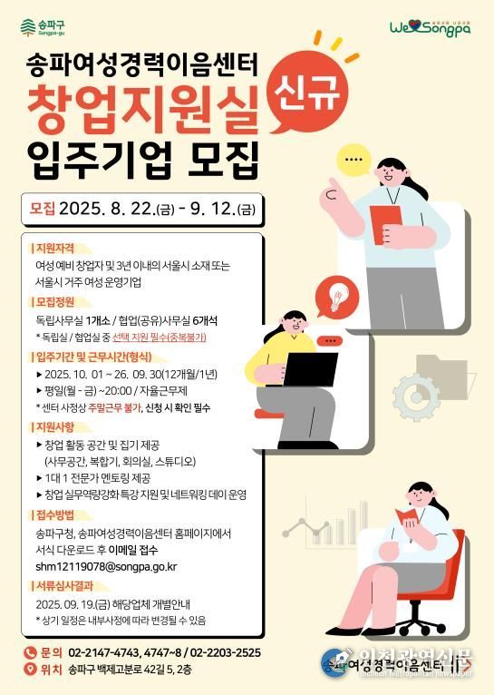 [인천광역신문] 최훈 기자 | 서울 송파구가 올가을 송파여성경력이음센터 창업지원실에 입주할 신규 여성(예비)사업체 7곳을 오는 12일까지 모집한다고 알렸다.