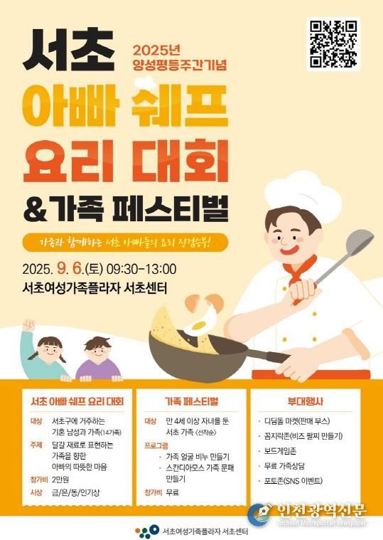 [인천광역신문] 최훈 기자 | 서울 서초구는 오는 9월 6일, 서초여성가족플라자 서초센터에서 '서초 아빠 쉐프 요리대회 · 가족 페스티벌'을 개최한다고 밝혔다.