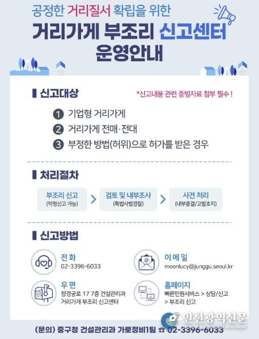 중구는‘K-관광 1번지’의 명성을 지키기 위해‘거리가게 운영 부조리 신고 창구’를 개설하고, 불법·부정 행위를 집중 단속한다고 밝혔다.