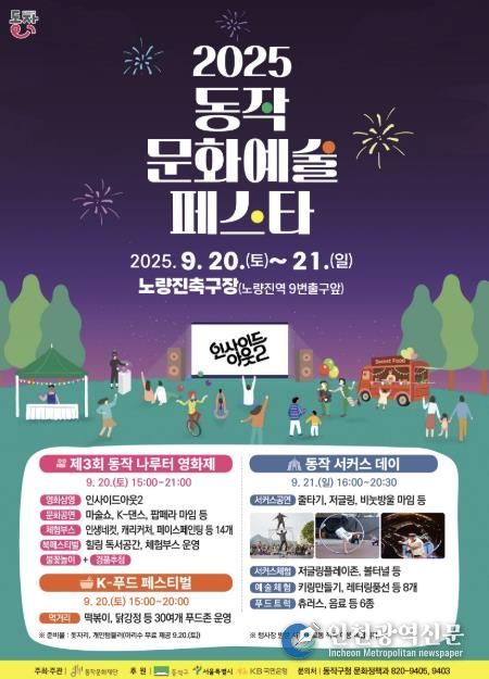 [인천광역신문] 최훈 기자 | 동작구가 다양한 문화예술을 한자리에서 만끽할 수 있는 대규모 특화 축제 ‘동작 문화예술 페스타’를 오는 20~21일 이틀간 노량진 축구장(노들로 688)에서 개최한다고 밝혔다.