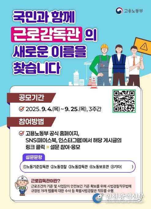 [인천광역신문] 관리자 기자 | 고용노동부는 9월 4일부터 9월 25일까지 약 3주간 ‘근로감독관’의 새로운 명칭을 공모한다고 밝혔다.
