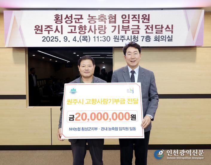 [인천광역신문] 관리자 기자 | NH농협 횡성군지부와 횡성군 지역 농축협은 고향사랑기부제 활성화를 위해 지난 4일 원주시에 고향사랑기부금 2천만 원을 전달했다.