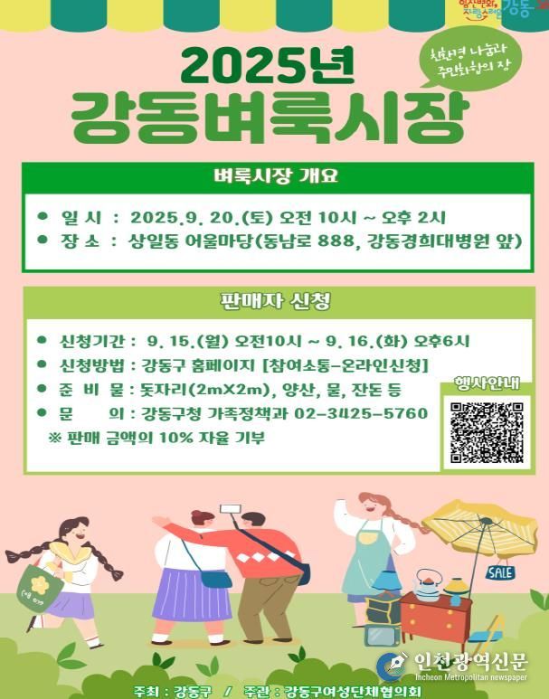 [인천광역신문] 최훈 기자 | 강동구는 오는 9월 20일 오전 10시 상일동 어울마당(동남로 888)에서 ‘강동벼룩시장’을 개장한다고 밝혔다.