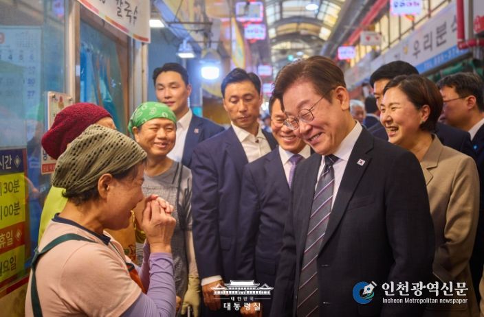 [인천광역신문] 관리자 기자 | 이재명 대통령은 'K-바이오, 혁신에 속도를 더하다' 토론회 개최 이후 인천 미추홀구에 위치한 용현시장을 깜짝 방문했다.