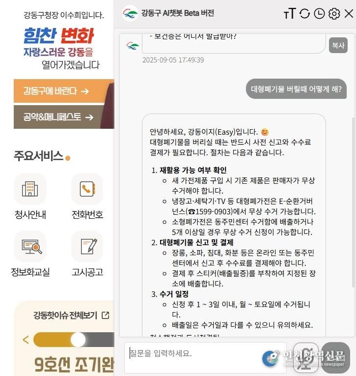 [인천광역신문] 최훈 기자 | 강동구가 오는 15일부터 생성형 AI 기반 홈페이지 챗봇 서비스인 ‘강동이지(EASY)’의 시범 운영을 시작한다고 8일 밝혔다.