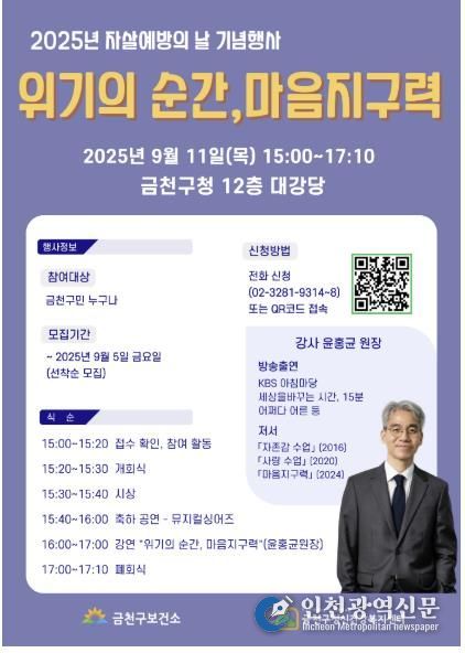 [인천광역신문] 최훈 기자 | 금천구는 10일 세계 자살예방의 날을 기념해 11일 오후 구청사 12층 대강당에서 기념행사를 개최한다고 밝혔다.