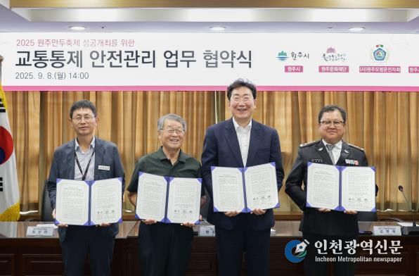 [인천광역신문] 관리자 기자 | 원주시는 오는 10월 24일부터 26일까지 열리는 ‘2025 원주만두축제’의 성공적인 개최를 위해 지난 8일 시청 7층 투자상담실에서 원주시자율방범연합대 및 (사)원주모범운전자회와 교통 통제·안전관리 협약을 체결했다.