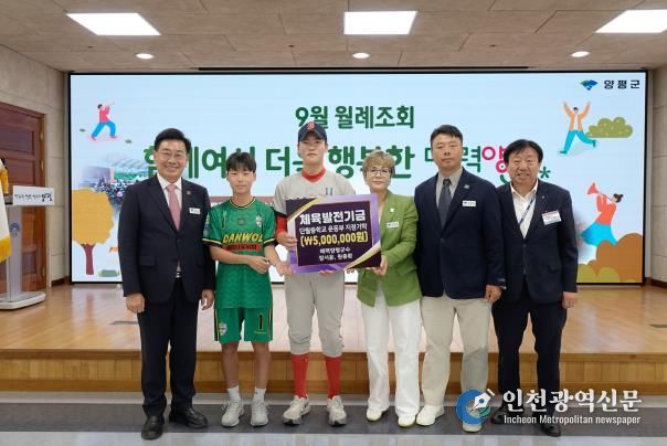 [인천광역신문] 관리자 기자 | 양평군은 지난 3일 군청 대회의실에서 열린 월례조회에서 장서윤, 원종환 매력양평 군수가 단월중학교 운동부를 위해 500만 원을 지정 기탁했다고 밝혔다.