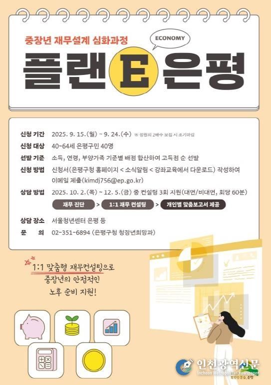 [인천광역신문] 최훈 기자 | 서울 은평구는 중장년의 안정적인 노후 준비 지원을 위해 1:1 맞춤형 재무컨설팅 ‘플랜 E 은평’을 운영하고 신청자를 모집한다고 밝혔다.