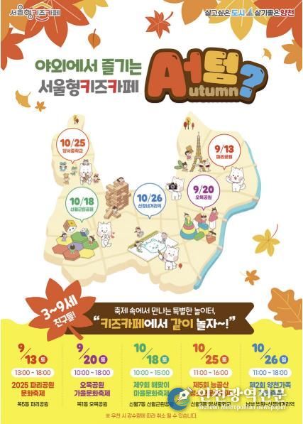 먼저 9월 13일 개최되는 ‘파리공원 문화축제’에서는 ‘파리에서 놀다 가자’를 주제로 에펠탑 집라인, 개선문 블록쌓기, 쁘띠떼제베 등 파리의 상징물을 활용한 테마 놀이터가 운영되어 아이들이 세계문화를 놀이로 경험할 수 있고, 9월 20일 열리는 ‘오목공원 가을문화축제’에서는 ‘가을놀이터’를 테마로 밤 찾기, 나뭇잎 날리기, 캠핑놀이 등 계절의 감성을 담은 놀이공간이 펼쳐진다.
