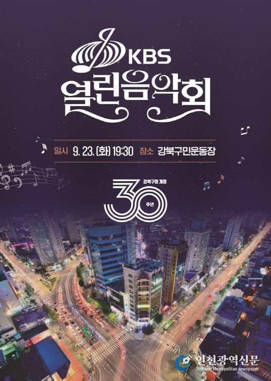 [인천광역신문] 최훈 기자 | 강북구는 개청 30주년을 맞아 오는 9월 23일 오후 7시 30분, 강북구민운동장에서 'KBS 열린음악회'를 개최하고, 오는 15일 오전 10시부터 공연 초대권을 선착순 배부한다.
