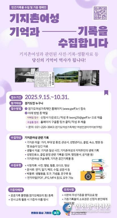 [인천광역신문] 관리자 기자 | 경기도와 경기도여성가족재단은 ‘기지촌여성 인권 기록 아카이브 구축사업’의 하나로, ‘기지촌여성 민간기록물 수집 및 기증 캠페인’을 9월 15일부터 10월 31일까지 추진한다.