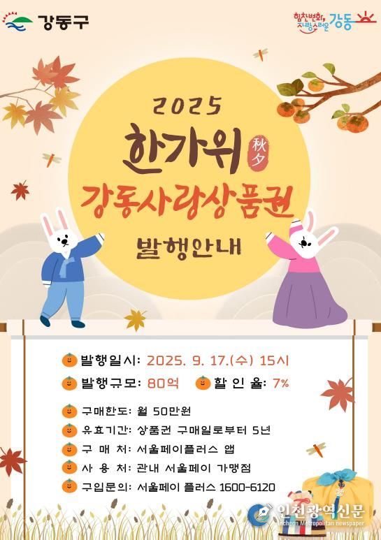 [인천광역신문] 최훈 기자 | 강동구는 추석 명절을 맞아 9월 17일 15시부터 총 80억 원 규모의 강동사랑상품권을 7% 할인 판매한다고 밝혔다.