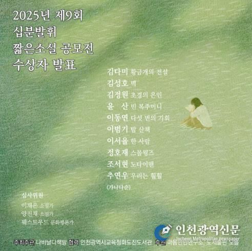 [인천광역신문] 최예준 기자 | 인천광역시교육청화도진도서관은 배다리 지역서점 ‘나비날다책방’이 주관하고 화도진도서관이 협력한 2025년 제9회 ‘십분발휘 짧은 소설 공모전’ 수상자를 10일 발표했다.