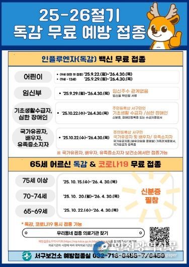 [인천광역신문] 최예준 기자 | 인천 서구는 오는 9월 22일부터 2025~2026절기 인플루엔자(독감) 무료 예방접종을 실시한다고 9일 밝혔다.